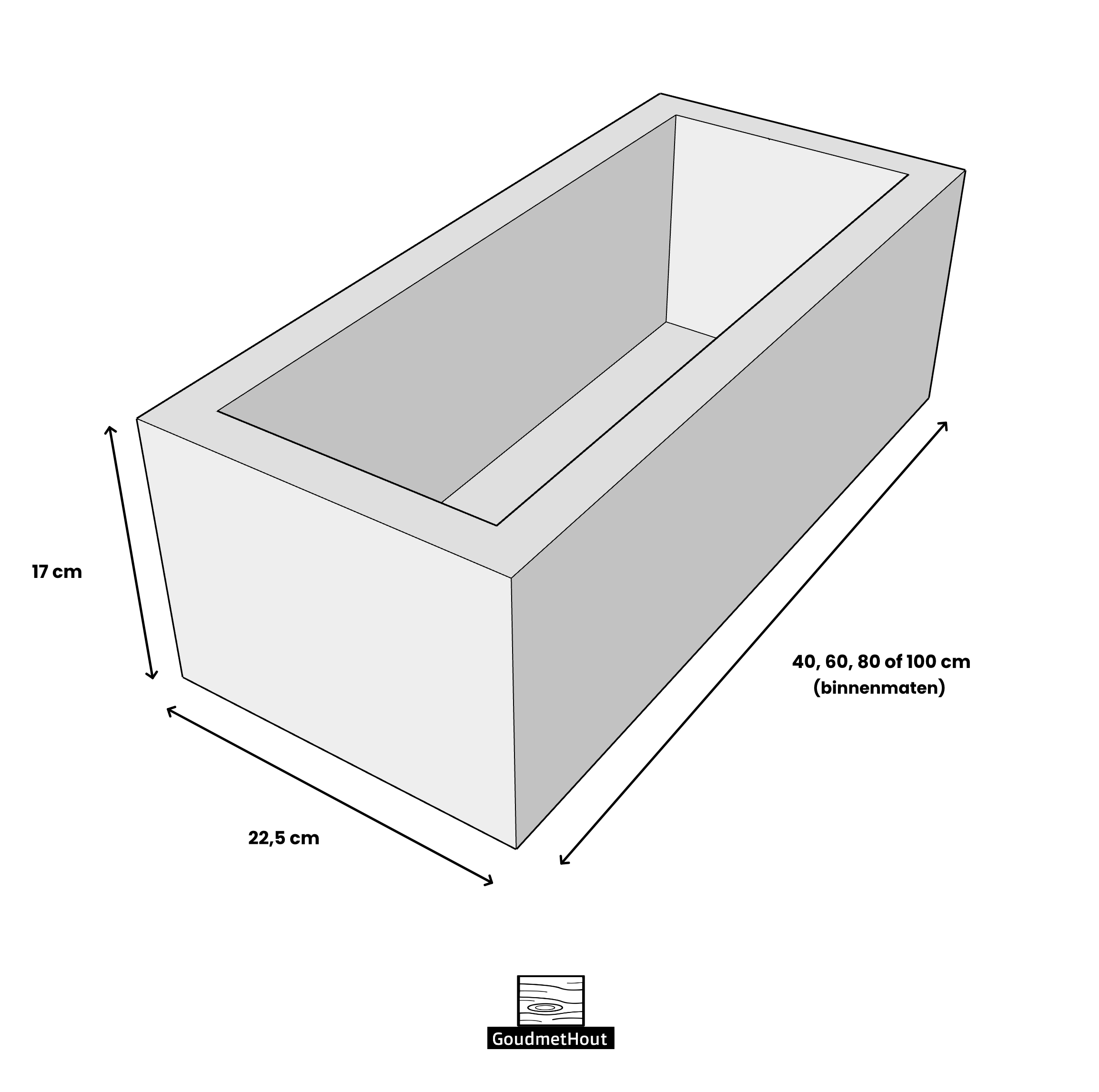 Wil je fleurige planten in een bak aan je balkonreling hangen? Kies dan voor onze duurzame houten plantenbakken. Op maat te maken voor elke balkonreling! De plantenbakken zijn 17 cm hoog en 22.5 cm diep (buitenmaten). Je kunt kiezen uit vier lengtematen: 45, 65, 85 en 104 cm (buitenmaten). De plantenbakken zijn inclusief twee rvs ophangbeugels met schroeven die zorgen voor veilige en stabiele bevestiging aan de balkonreling. Lekker slim: wij leveren bij de houten plantenbak een passende binnenbak. Je kunt in deze binnenbak zelf de afwateringsgaten maken die jij denkt nodig te hebben.
