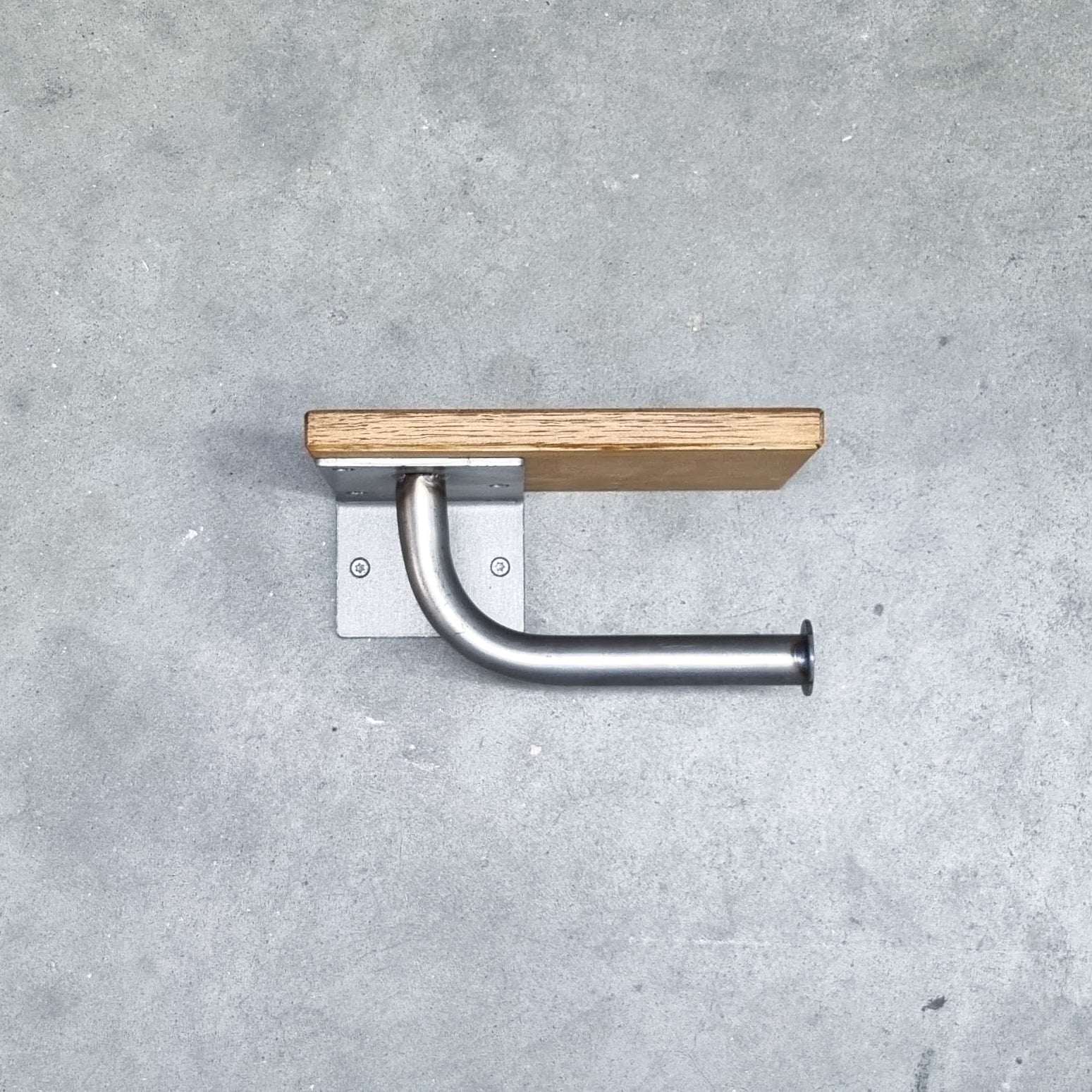Set bestaat uit een toiletrolhouder, reserverolhouder en een handdoekhaakje Combinatie van stoer donker eiken met industrieel staal (mat blanke coating) Afmetingen plankje 19,5 cm x 12,5 cm Inclusief bevestigingsmateriaal