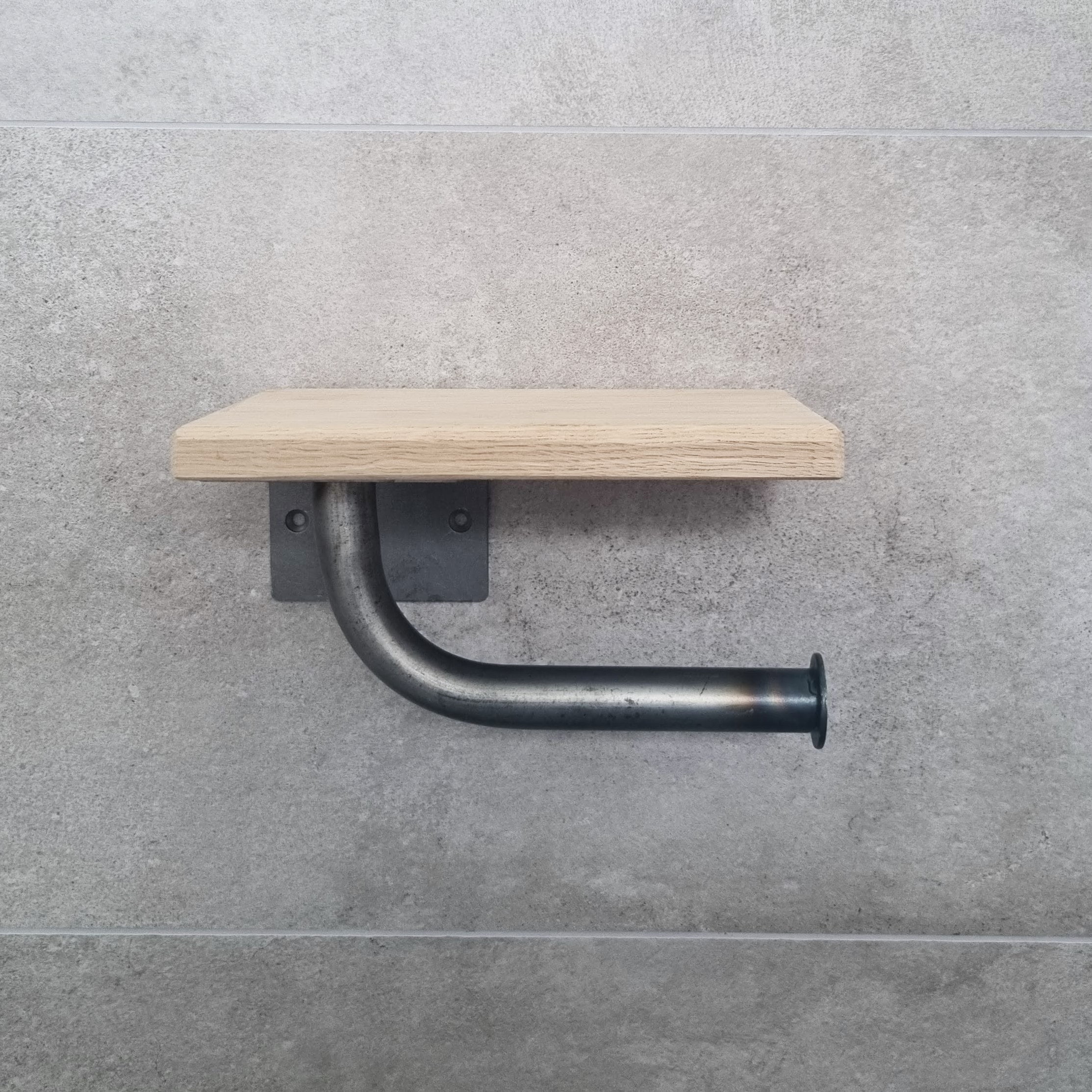 Toiletrolhouder met handig licht eiken plankje Stoer met de hand afgewerkt eiken met houder van staal Mat blanke coating Stijlvol en praktisch Inclusief bevestigingsmateriaal Afmetingen plankje 19.5 cm x 12.5 cm