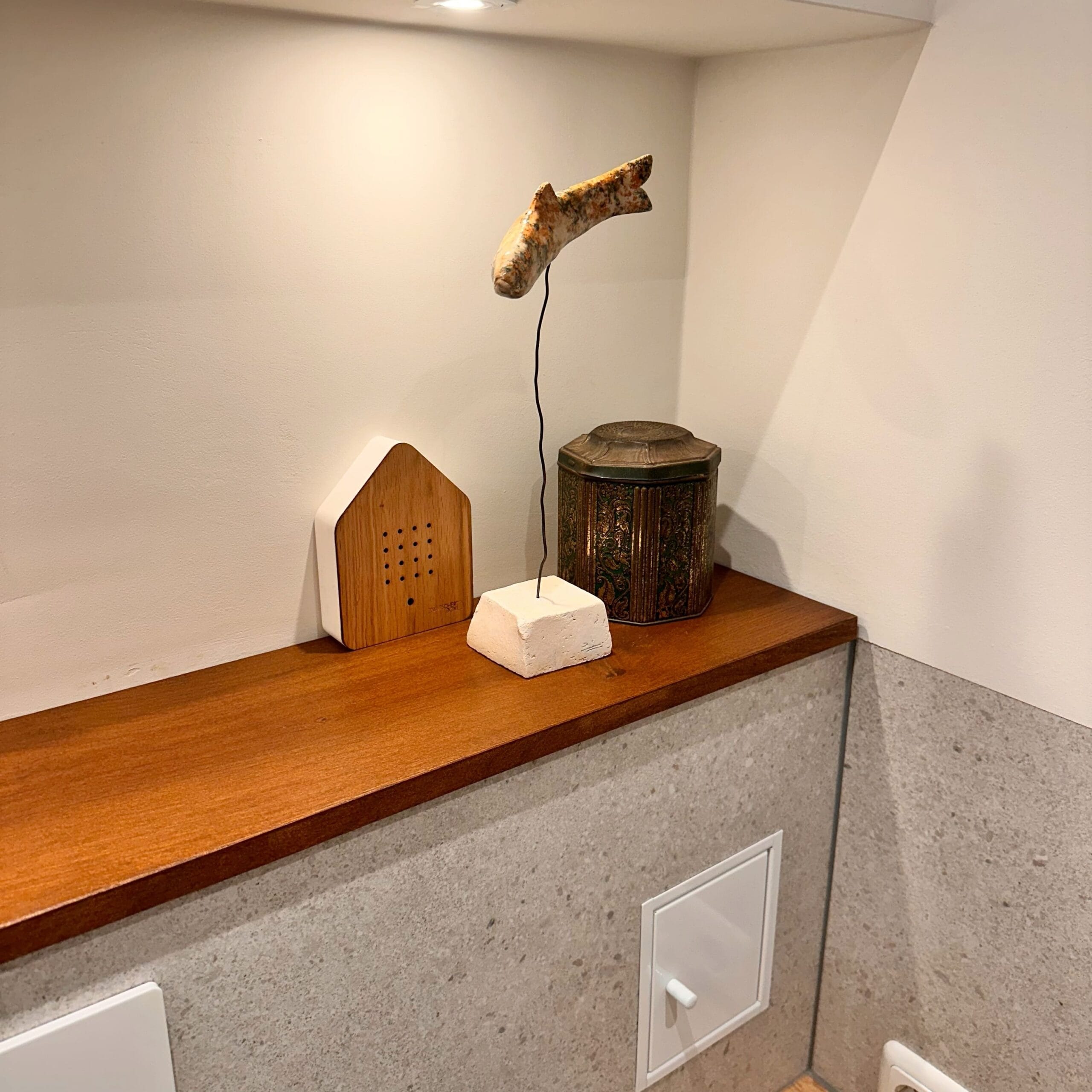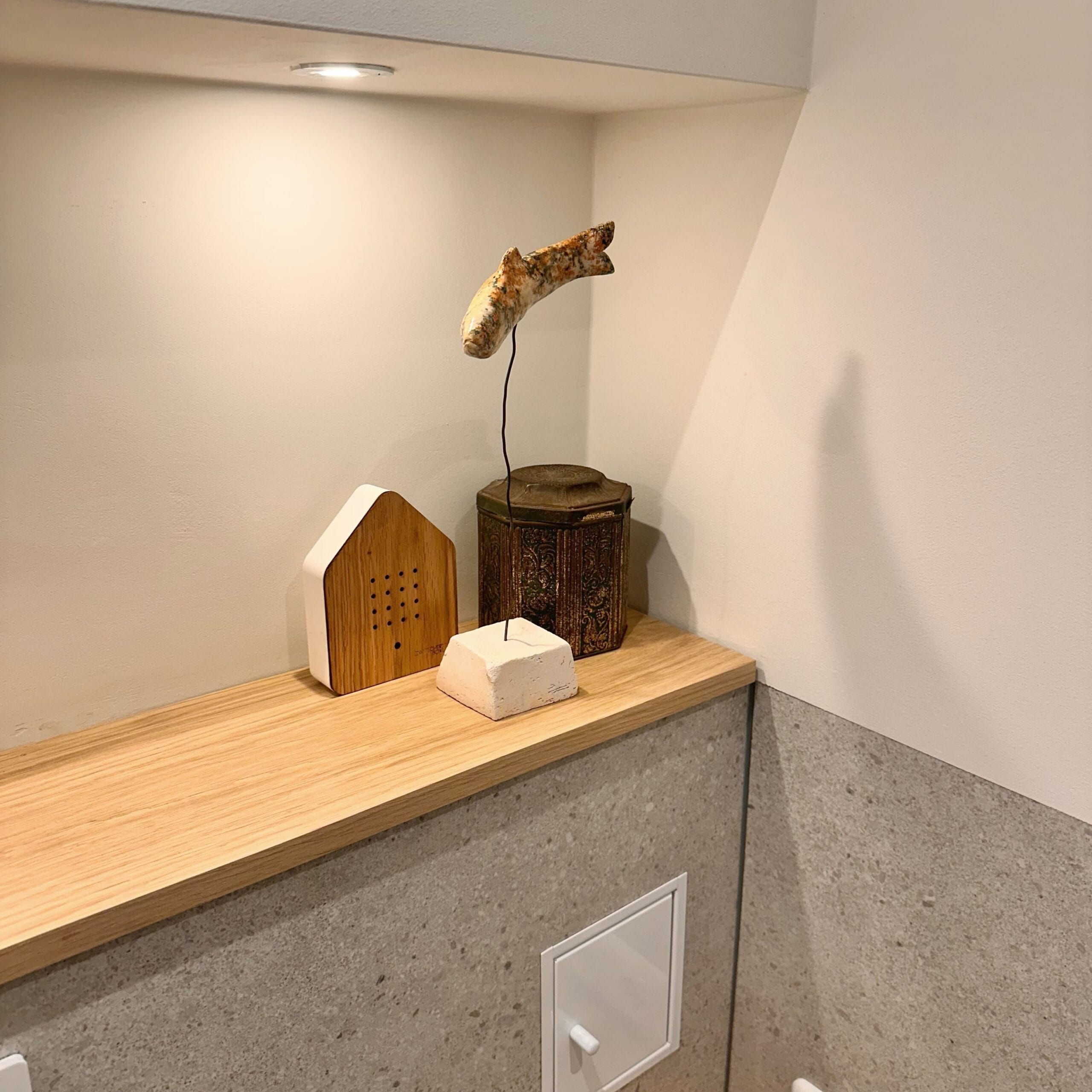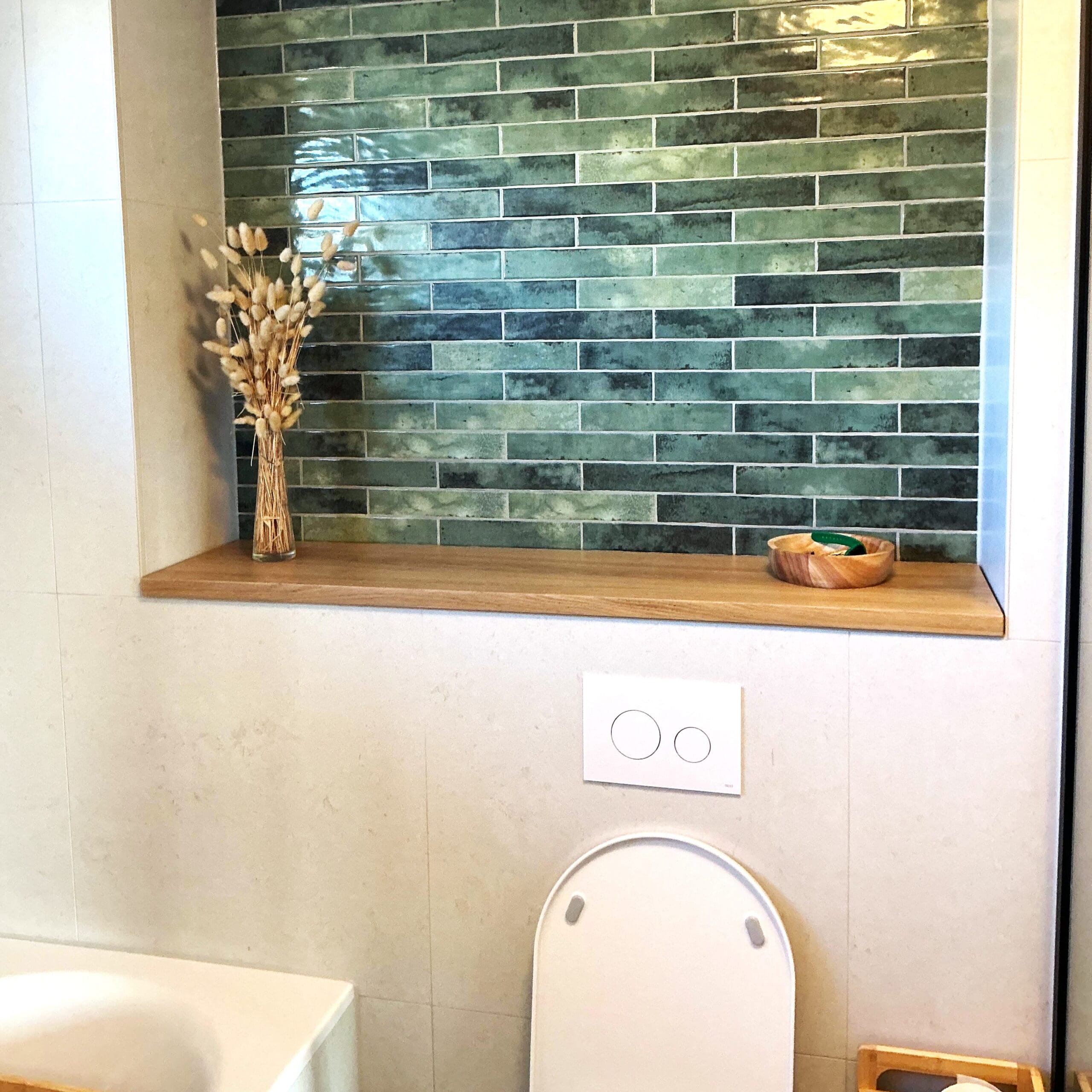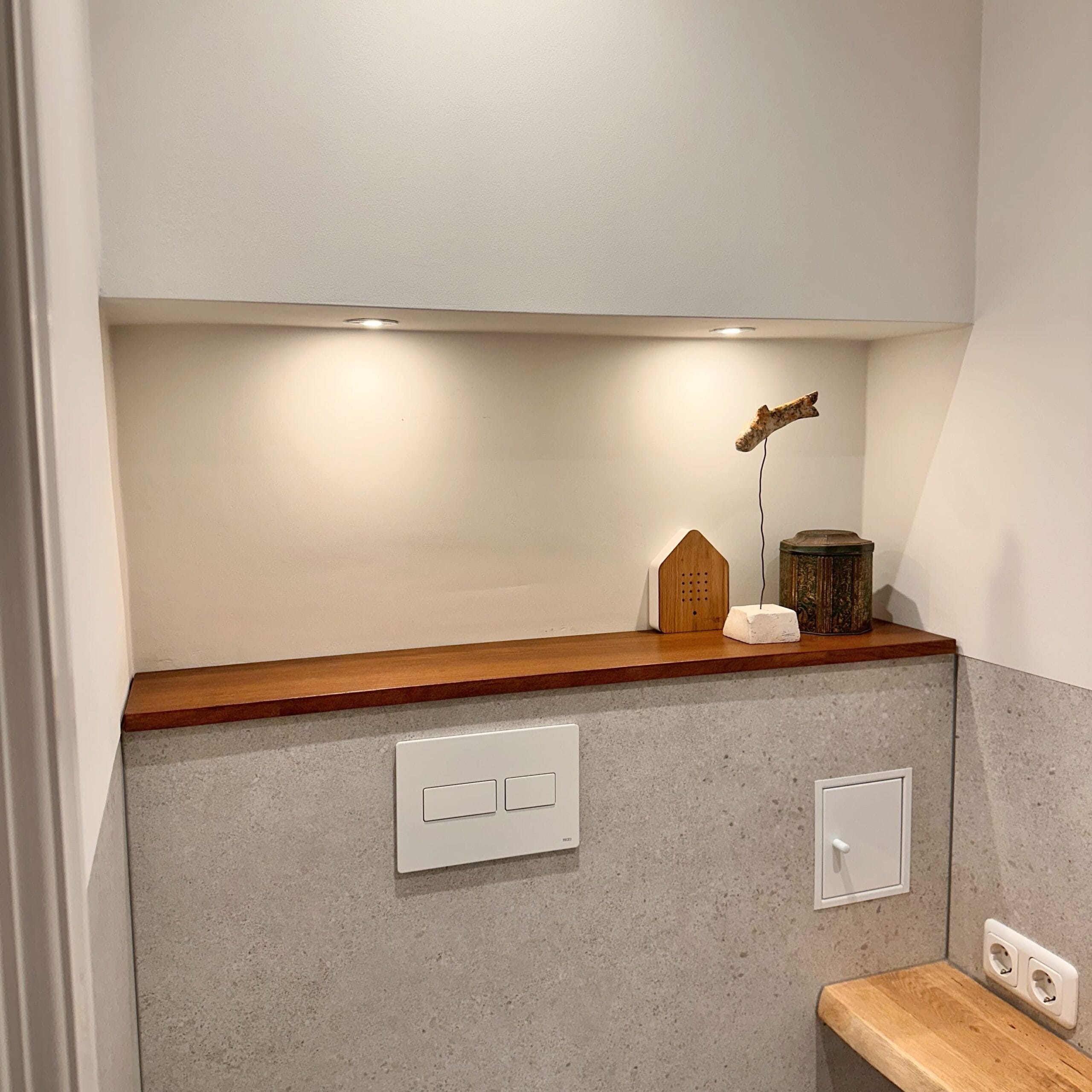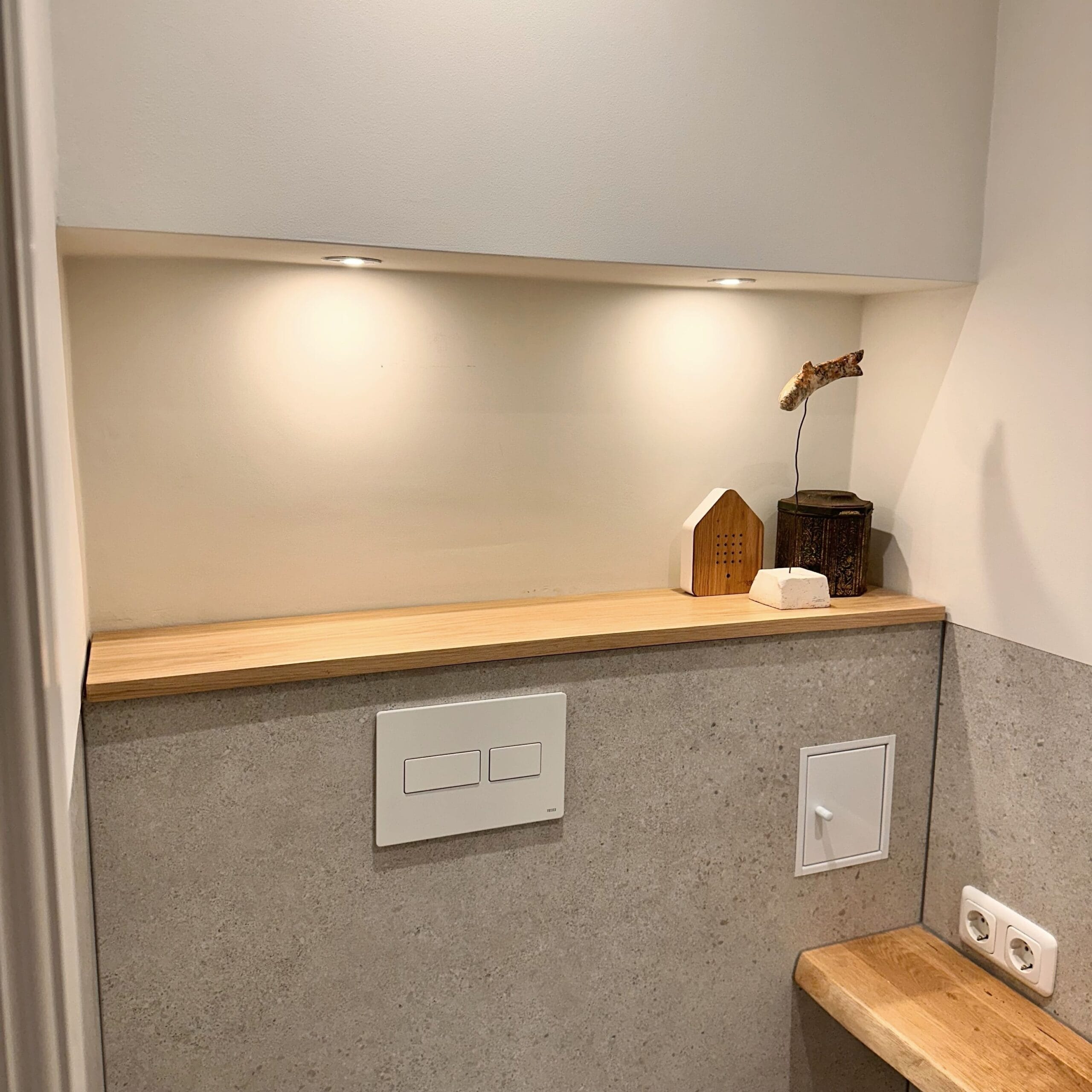 (Tip: neem de plank iets dieper – zo’n 1 tot 1,5 cm over de rand oogt vaak mooier en maskeert het wanneer de nis links en rechts niet even diep is)
