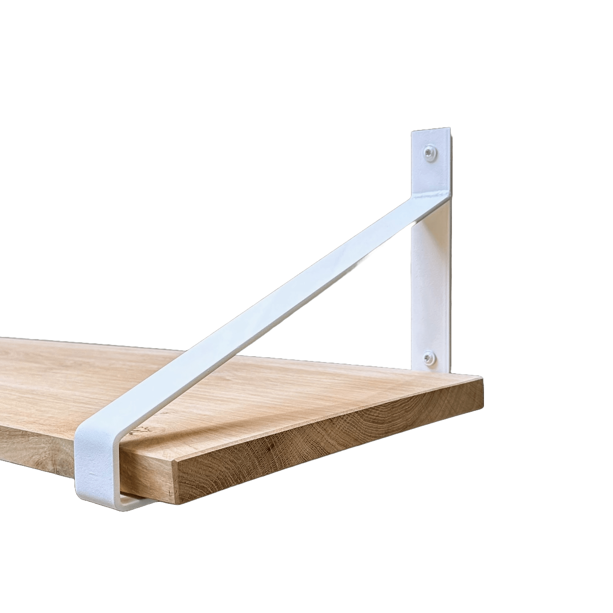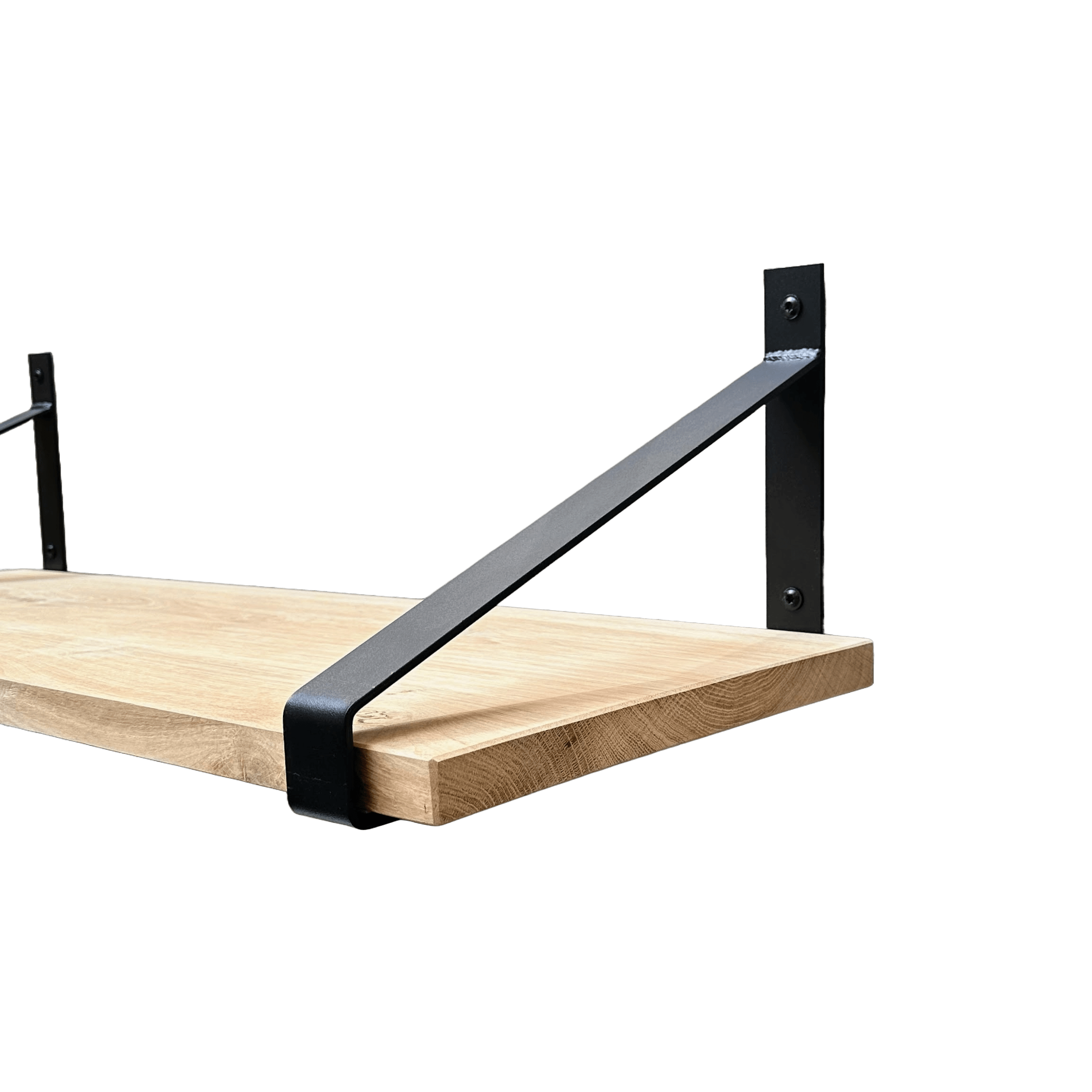 Industriële plankdragers met eiken plank, standaard inclusief twee plankdragers (in kleur naar keuze) met bevestigingsmaterialen (zie afbeelding). De plank heeft een robuuste uitstraling. Uniek door z’n eigen noesten, vlekken en scheuren. Een sfeervolle aanwinst voor je interieur. Ook leuk als boekenplank! Deze eiken plank is extra breed en verlijmd uit twee stroken massief eiken. Handig formaat om bijvoorbeeld grotere borden of bredere (keuken)apparaten op te zetten!
