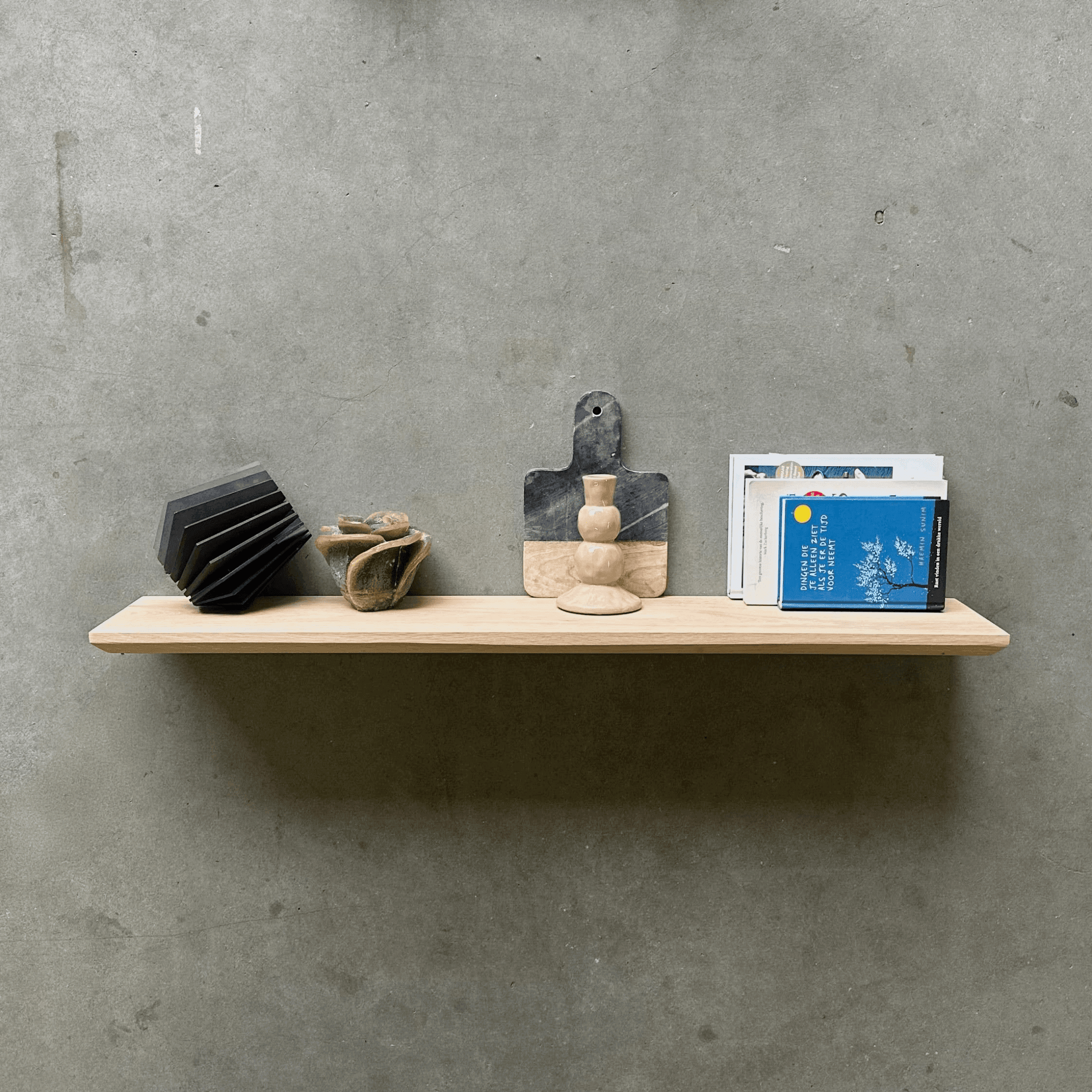De zwevende wandplank is van stoer eiken en leverbaar in alle lengtes. De diepte kies je zelf: 10, 15, 20, 25 of 30 cm. De plank wordt standaard geleverd met twee houders met pen.